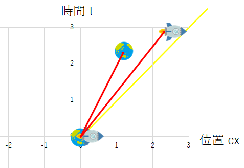 これをロケットを中心に考えてみれば、動いているのは地球の方です。 まったく同じ出来事も少し頭を切り替えてみれば、次のような座標系を思い浮かべることができます。